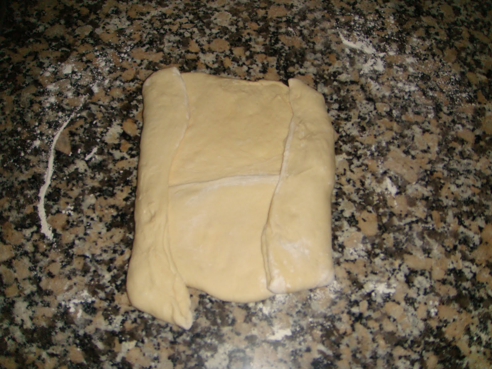 Para hacer los pliegues estiramos la masa y la doblamos como si fuera un tríptico. Se divide la masa mentalmente en tres, y se coge de la izquierda y se dobla hacia el centro, y luego de la derecha también se dobla hacia el centro.