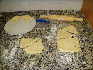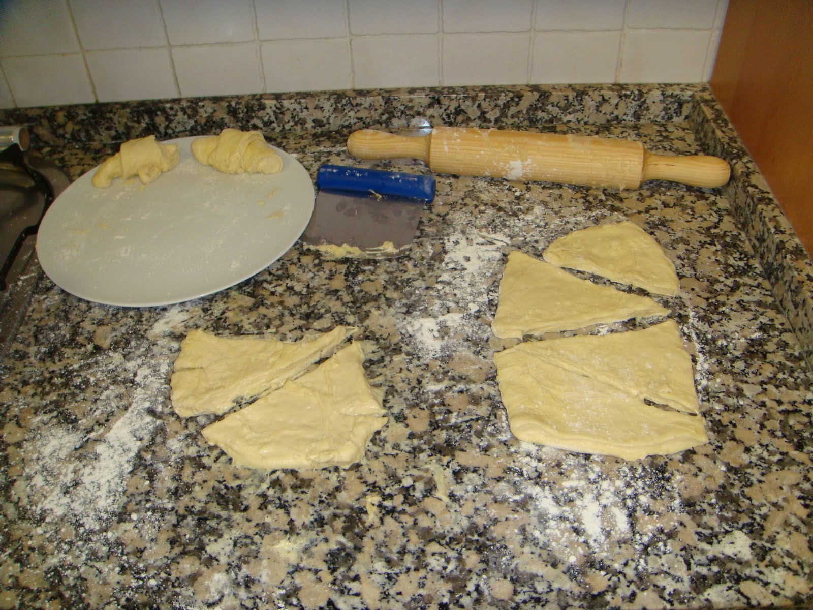 Con el problema de la mantequilla escurriéndose por todas partes, me las vi y desee para estirar la masa y formar los cruasanes!! Pero bueno... lo que he hecho ha sido estirar la masa todo lo que he podido y luego dividirla en dos e intentar estirarla un poco más... al final creo que al no poder estirarla todo lo que hubiera querido me han salido menos cruasanes de los que yo hubiera hecho... y además con unas formas no demasiado perfectas!!!